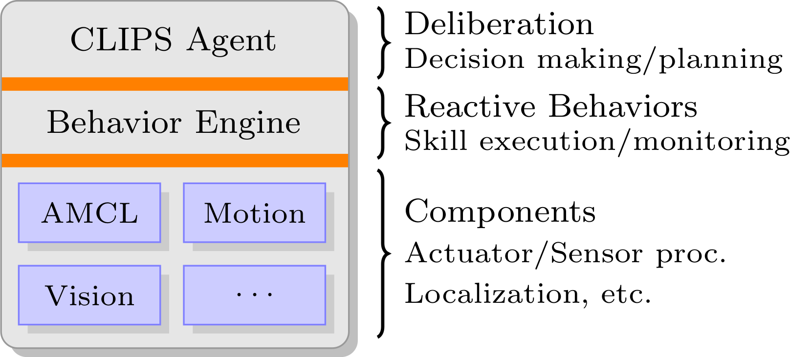 Based on a classic three-layer separation we will detail how to generate the overall coordinated behavior of the group of robots. Topics will cover basic reactive behaviors Lua-based Behavior Engine, agent design (with our CLIPS-based agent as one specific existing example), and inter-robot communication. The hands-on session will involve to create basic behaviors and a minimal agent to perform a sub-task of the competition.